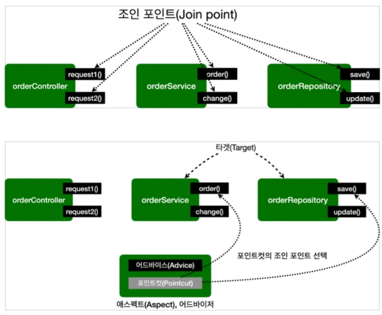 → 포커스: "어디에 흩어져 있는가?"출처: https://www.javaguides.net/2019/05/understanding-spring-aop-concepts-and-terminology-with-example.html